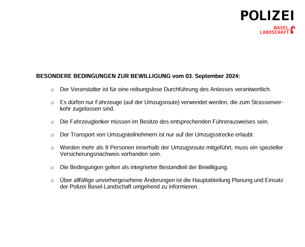Alli Fahrzüüg müen sicher und ordnigsgmäs kennzeichnet si. Nur vo uns zueglooeni Fahrzüg dörfe am Umzug mitmache. Also keini wilde Drufgänger, nume guet markierti Wääge.