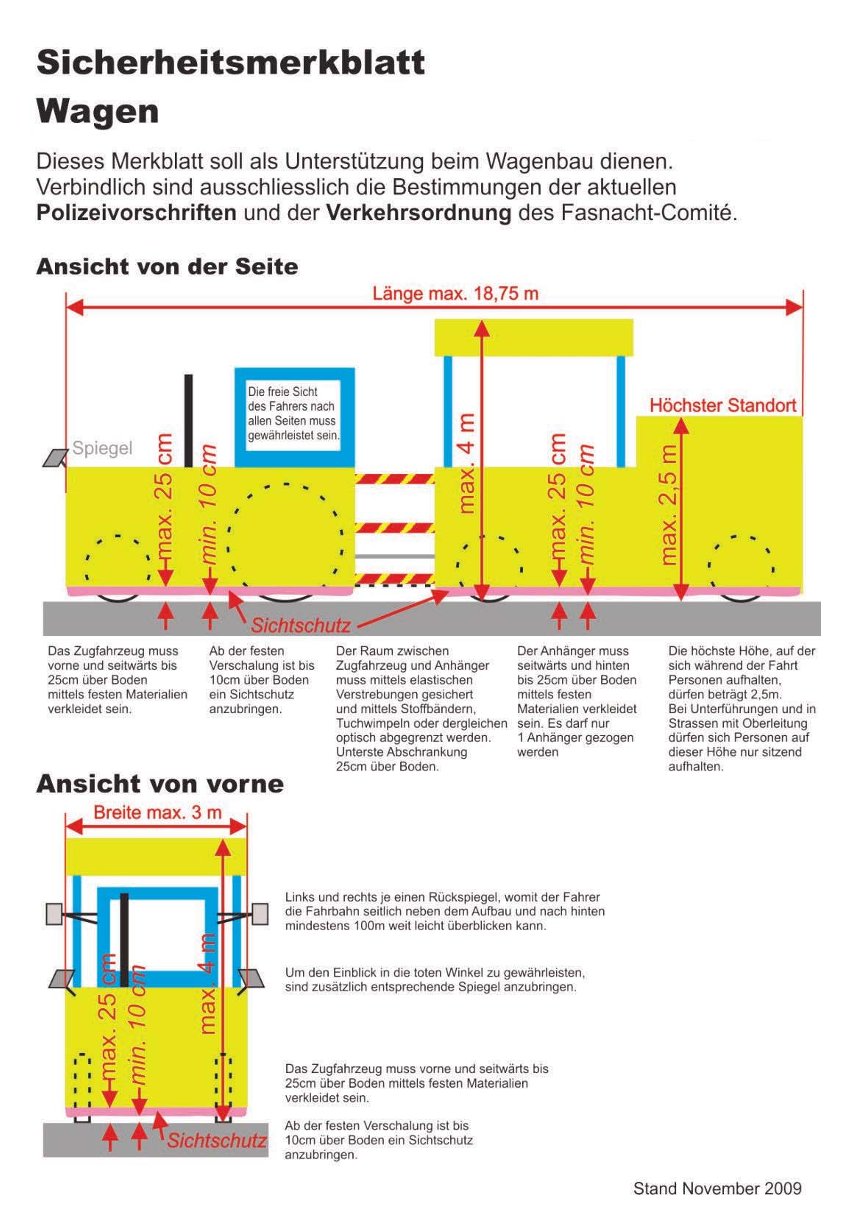Versicherungen / SicherheitsbestimmungenBei der Versicherung der Zugfahrzeuge ist deren Gültigkeit für den Fasnachtssonntag und die erweiterte Deckung für Anhänger und Personen abzuklären.