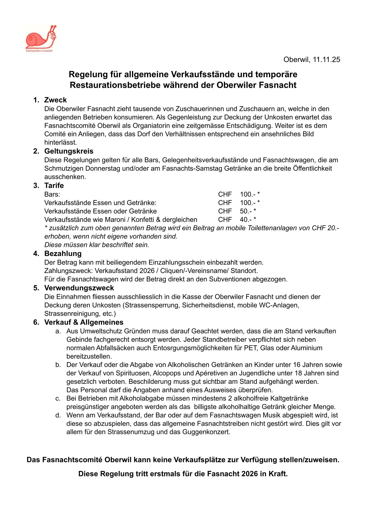 Für d Fasnacht 2026 hän mir vom Comité e neus Konzäpt für Bars, Verkaufsständ und Fasnachtswäge erarbeitet. Alli Infos findet dir...
